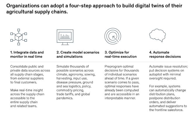 How advanced analytics can address agricultural supply chain shocks: Building automated supply chain planning systems to address global shocks could lead to significant cost savings for agricultural organizations. The COVID-19 pandemic has also intensified supply chain shocks. Farmers around the globe, for instance, lost billions in earnings due to labor shortages, and farmers and agribusinesses suffered economic losses in the first wave of the pandemic due to the closure of trade channels (such as food services), labor shortages, delays in food and raw-material deliveries, and slowdowns in food production caused by virus outbreaks at processing plants. Also in a 3rd world country like Sri Lanka experienced lack of fertilizers to grow their traditional crops. Food processing plants in many countries have also been hard-hit. In addition, extreme weather and the pandemic have caused fertilizer prices to increase, adding to global inflationary pressures. Average 2021 nominal prices of diammonium phosphate and urea, for instance, were about 96 percent higher than their 2019 averages. In turn, increasing fertilizer prices have contributed to global food insecurity, as global food prices in 2021 jumped to their highest level in a decade. The ongoing conflict in Ukraine is further compounding the situation, with the Food and Agriculture Organization of the United Nations stating that the global supply gap from potential shortfalls in agricultural exports from Russia and Ukraine could raise international food and feed prices by more than 20 percent. To respond to agricultural supply chain shocks caused by these kinds of notable events, agricultural companies such as food processors and input providers can consider implementing the next generation of end-to-end supply planning based on a four-step approach. This approach involves the integration of data sources to enable real-time monitoring; simulation to produce various supply chain scenarios; deployment of appropriate optimization algorithms for real-time responses to shocks; and full automation of the first three steps to produce automatic response systems.