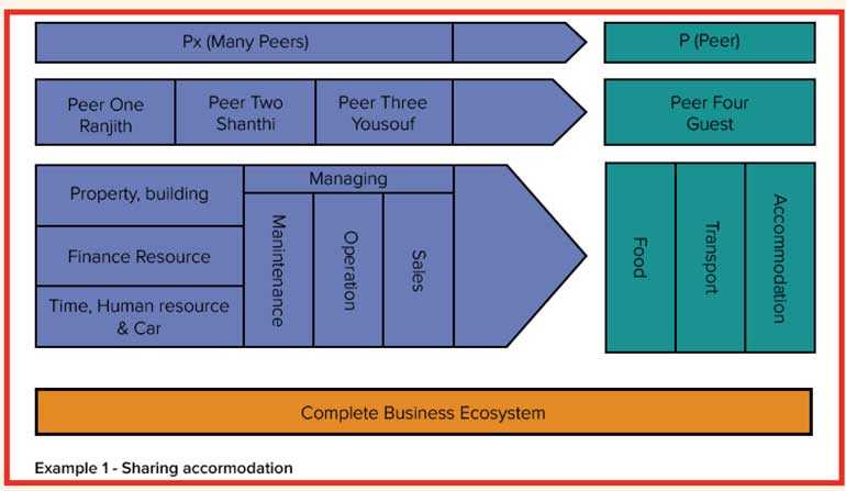 Using AirBnB as a sharing accommodation example, Ranjith (Peer One), a busy corporate executive has space to build a self-sustaining studio room to his house, however, with limited time and financial resources. Shanthi (Peer Two) who has financial resources and Yousouf (Peer Three), a retired gentleman with time availability and a car to share, get together with Ranjith, build the studio room and list it on AirBnB. All three Peers gain benefits proportionately with the monthly revenue generated by letting the studio apartment to guests (Peer Four). Refer to Example 1.